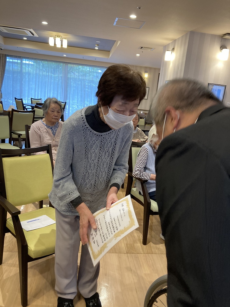 皆様にはホーム長から表彰状をお渡しし、お祝いの言葉をお伝えしました。