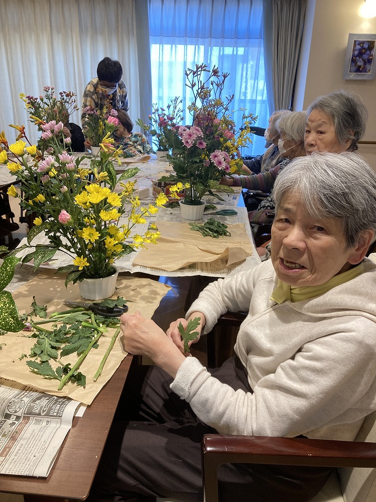 当ホームにて毎月恒例 「フラワーアレンジメント」 今回は13名のご入居者に参加いただきました(^^)/ ひとつひとつ手に...