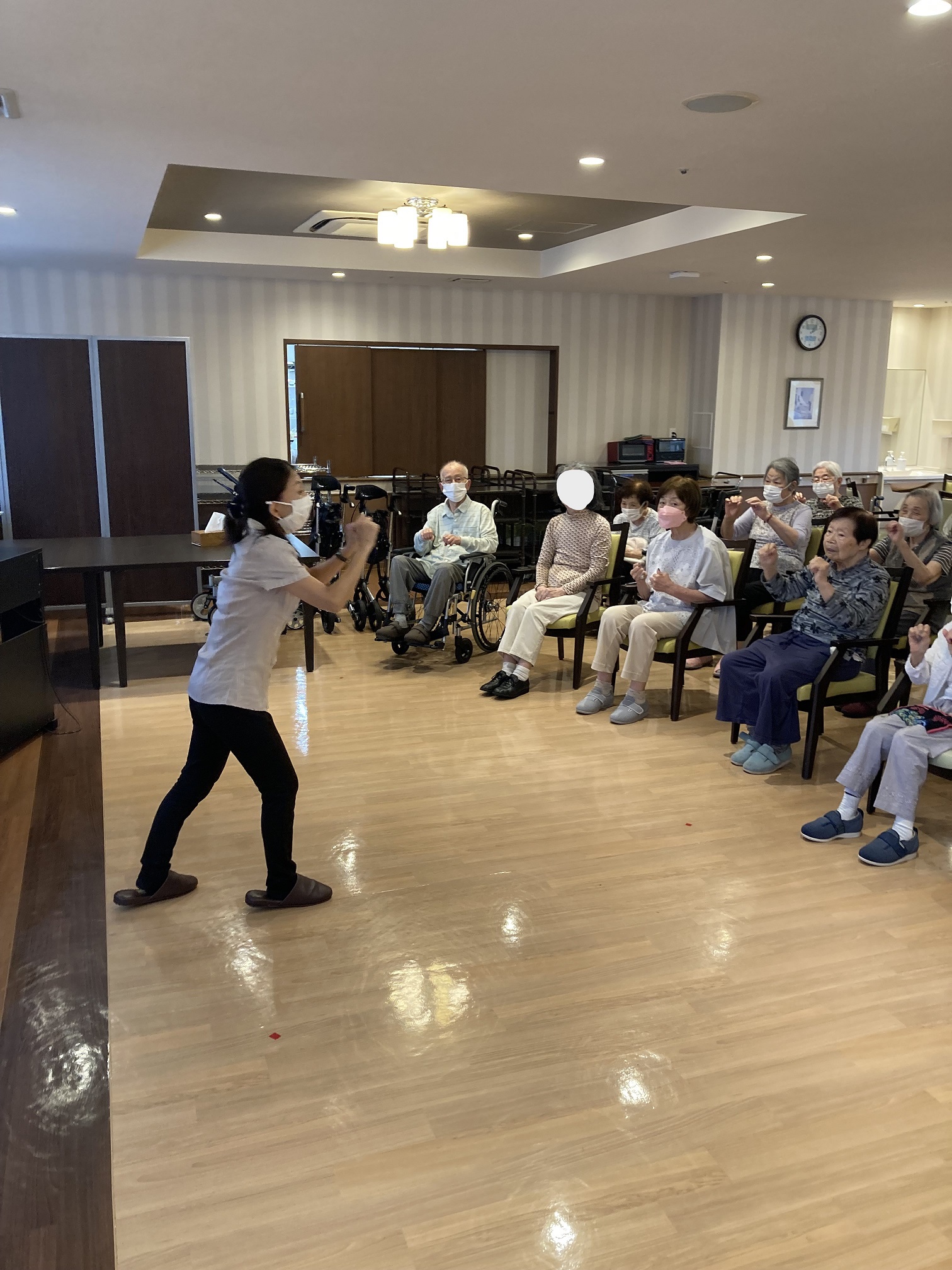 7月12日に毎月開催されているホーム恒例の 「リトミック体操」が開催されました。 懐かしい唱歌、季節の童謡などを歌い、同...