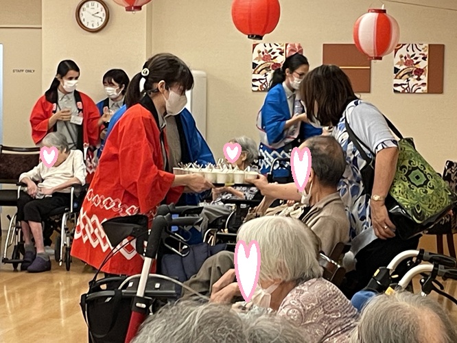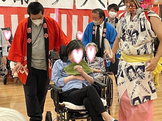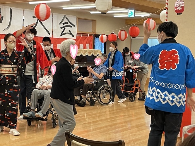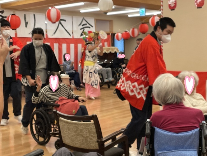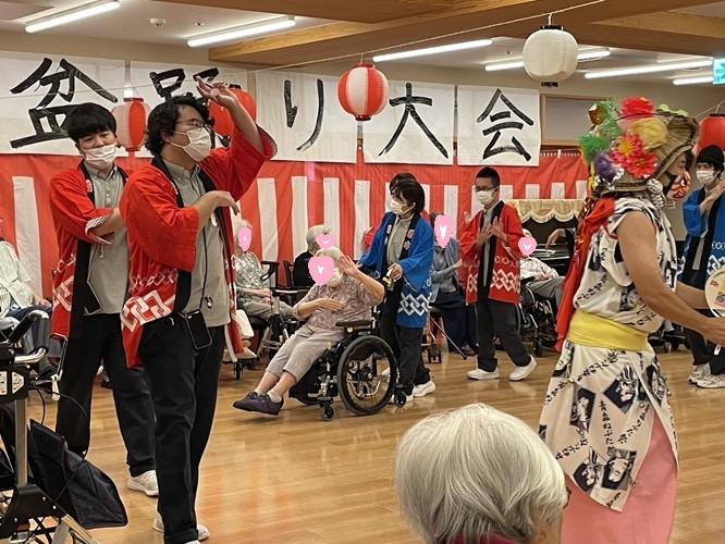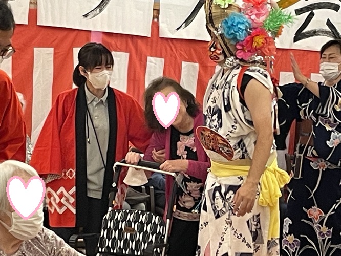 青森県出身ケアマネジャーの本場ねぶた祭りの跳ね子も登場し、職員とご入居者、