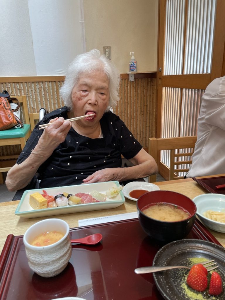 お寿司屋さんに入るとS様は急にシャキッと気持ちが入り、ご自身で醤油を準備し、お箸を持ち、食べたいネタを選ばれていました。普段は持つことが難しいお寿司屋さんの重い湯呑も震える手で持ち、熱いお茶を口へ運ぼうとされていました。とにかく重い湯呑でしたので、スタッフが手を添えようとすると、「いいわよ」と仰り、お寿司もお一人で召し上がることができました。