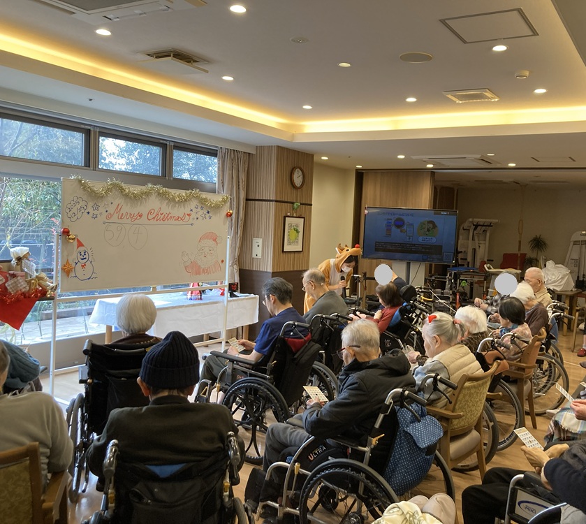 はじめに、「もろびとこぞりて」をご入居者と一緒に歌い、会場は一気にクリスマスの雰囲気に包まれました。歌声に合わせて手拍子をされたり、口ずさまれたりと、和やかな時間となりました。